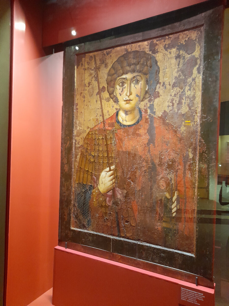 Сейчас в Кремле проходит выставка «Небесное воинство. Образ и почитание». Интересной она обещала быть хотя бы потому, что в ней участвуют не только Музеи Кремля, но и Эрмитаж, Третьяковская галерея, ГИМ и Музей русской иконы, т.е. всё самое лучшее и отборное по заданной теме. Однако выставка сумела меня удивить. В первую очередь меня заинтересовала икона «Святого Великомученика Георгия», датируемая концом XI века. Я знала про неё раньше, но оказалось, что это вторая по древности икона России и самая хорошо сохранившаяся. Она двусторонняя, на оборотной стороне изображена Богоматерь Одигитрия. Образ Богородицы в XIV веке был поновлен, а про Георгия на оборотной стороне как будто забыли. В итоге до нас он дошёл в почти первозданном виде. Одиннадцатый век… Ей чуть меньше тысячи лет. На Русь ещё не пришли монголы, время расцвета городов и искусств. И вот свидетель жизни новгородцев начала прошлого тысячелетия стоит передо мной. Больше всего времени я провела перед иконой князя Юрия Всеволод