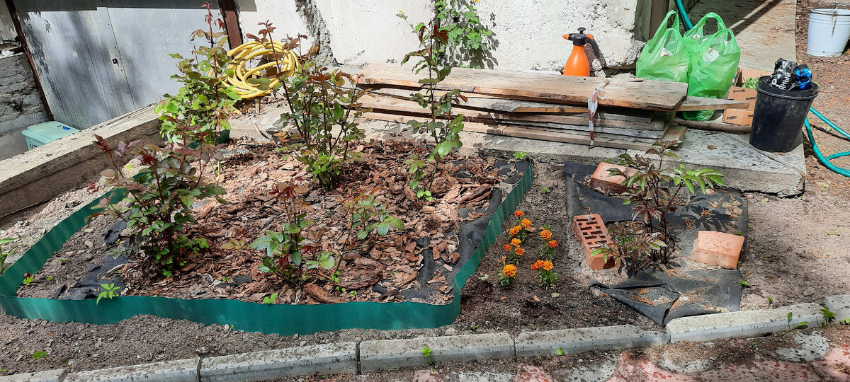 Первый объект - это небольшой участок прямо у дома. Неправильной формы. В прошлом году я посадила здесь 5 кустов роз и 1 пион. Розы были замульчированы, при этом мульча требовала подсыпки, остальное регулярно покрывалось сорняками. Этой весной высадила немножко бархатцев в промежуток между розами и пионом. Выглядело все это небрежно, хотя на этом фото убраны все сорняки.