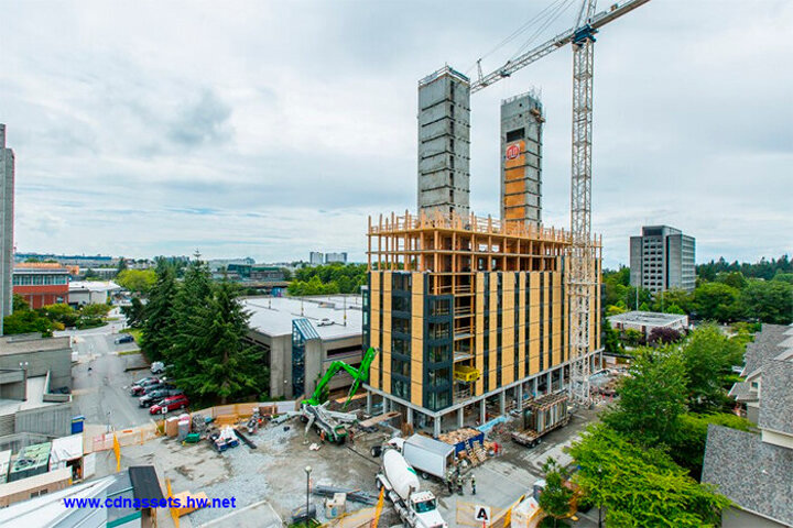 В студенческом городке университета города Ванкувер (Канада, Британская Колумбия) с применением CLT-технологии всего за 70 дней построено 17-этажное общежитие Brock Commone на 400 человек. Правда при его возведении использована комбинированная технология: из CLT-панелей созданы перекрытия и ограждающие конструкции, а силовой каркас создан с применением LVL-балок. Кроме того здание высотой 53 м разделено железобетонными плитами на несколько сегментов, что придаёт конструкции дополнительную жесткость.