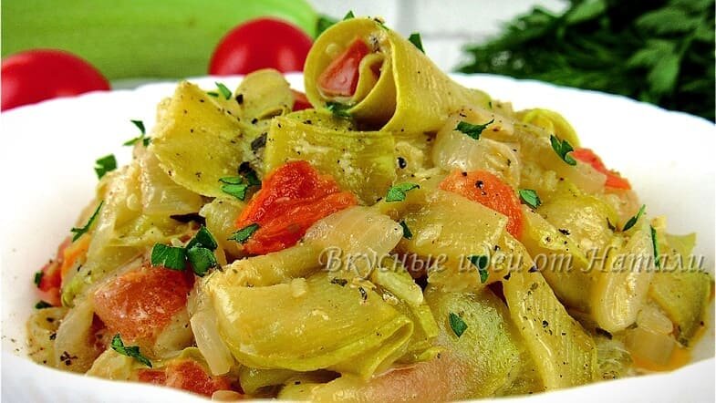 Понадобится всего 2 кабачка, чтобы приготовить это блюдо из кабачков. Несмотря на простой состав и максимально простое и быстрое приготовление, это блюдо получается безумно вкусным, сочным, ароматным. Никаких секретов нет, все дело в прекрасном сочетании ингредиентов. Попробуйте обязательно. Подробный процесс приготовления в коротеньком видео рецепте и пошаговом описании ниже: Рецепт как приготовить вкусное овощное блюдо из кабачков, помидоров и лука: С помощью овощечистки тонко нарезаем кабачки, чтобы получились тонкие продолговатые полоски. Дальше тонко нарезаем лук. И сразу лук отправляем обжариваться на небольшом количестве растительного масла. Дальше убавляем огонь, добавляем у луку кабачки. Немного солим и перемешиваем 2-3 минуты, пока кабачки станут более мягкими. Накрываем крышкой и оставляем так тушиться. Нарезаем на кубики помидоры, отправляем их к кабачкам. Снова перемешиваем. Оставляем тушиться 10 минут. Спустя это время добавляем все специи и майонез. Перемешиваем, не накр