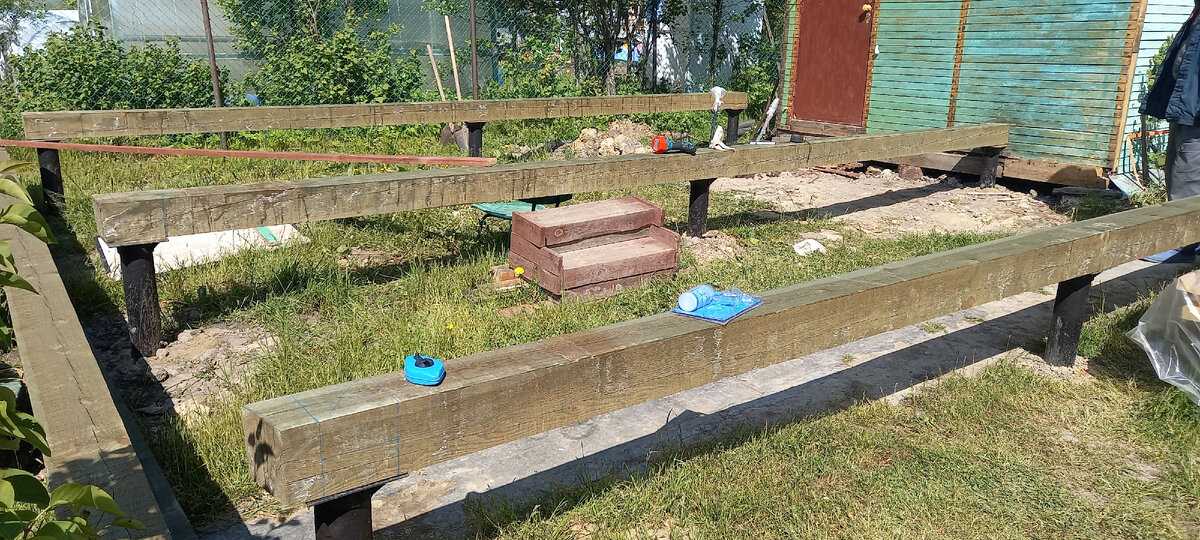 06.05.2023 Начали с обвязки бруса. Я и подумать не мог, что естественной влажности брус так тяжело пилится. Вылавливать диагонали тоже еще то удовольствие. Хотя когда смотришь блогеров у них все так просто. Не, правильно говорят 7 раз отмерь, один раз отрежь. Все вроде выставили, все гуд. Черчим, что где пилить, глядь а один ушел и поновой начинаешь чертить, опять все измеряешь, глядь диагональ ушла, и снова вылавливаешь и так по несколько раз. В общем, все выставили, просверлили. Будем крепить шпильками и глухарями к сваям. Как то так