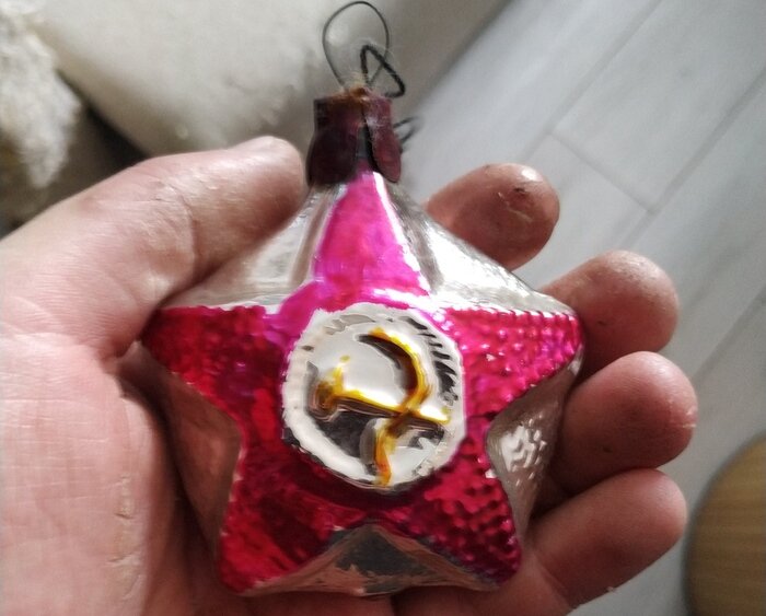 Тут на днях разбирал ёлочные игрушки, которые принадлежали ещё моей прабабушке и был сильно удивлён. Некоторым игрушкам по 60 лет. В большинстве игрушки из ГДР "как мне отец рассказал" Но есть и советские. Как например эта игрушка, шарик с звездой внутри которой серп и молот. У нас были некоторые старые игрушки, но эти недавно из гаража принесли и вот таких я не видел. Шпиль на макушку из ГДР, выглядит необычно, особенно колокольчики на его вершине. При чем, проволока которая оплетает шпиль не закреплена клеем или чем то другим, колокольчики же держатся за счёт проволоки которая оплетает другую проволоку. Или же, такая необычная рыбка, она уже советская, вероятно (как мне сказали) после военное изделие. Труба раскрашенная под хохлому. (К сожалению у неё отвалилась небольшая часть хвостика. Девочка в сарафане, цепляется за прищепку. Игрушка птицы, она так-же цепляется за прищепку, но самое интересное, что хвост у неё состоит из пучка пластиковых ниток. Игрушка вероятно из ГДР. Колокольч
