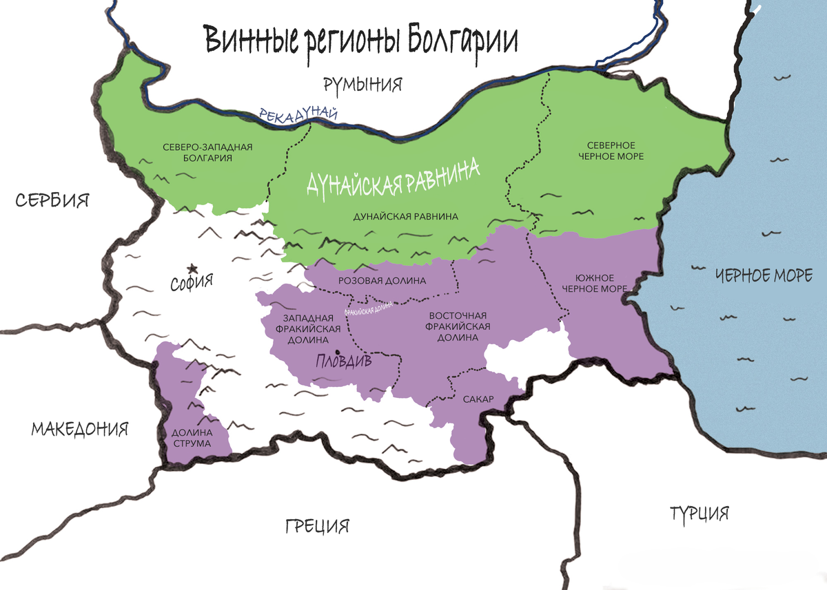 - Если вы поговорите с людьми в болгарской винодельческой промышленности, они верят, что страна в конечном итоге будет разделена на 9 регионов: Дунайская равнина, Северное побережье Черного моря, Южное побережье Черного моря, Восточно-Фракийская долина, Западно-Фракийская долина, Долина роз, Сакар и Струма. Долина реки. Это возможное будущее качества болгарских вин.
