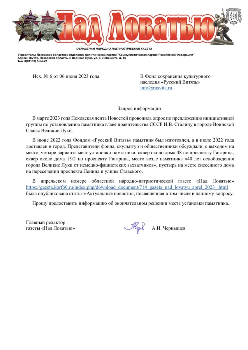 Поступил запрос следующего содержания: Запрос информации В марте 2023 года Псковская лента Новостей проводила опрос по предложению инициативной группы по установлению памятника главе правительства СССР И.В. Сталину в городе Воинской Славы Великие Луки. В июне 2022 года Фондом «Русский Витязь» памятник был изготовлен, а в июле 2022 года доставлен в город. Представители фонда, скульптур и общественники обсуждали, с выходом на место, четыре варианта мест установки памятника: сквер около дома 48 по проспекту Гагарина, сквер около дома 15/2 по проспекту Гагарина, место возле памятника «40 лет освобождения города Великие Луки от немецко-фашистских захватчиков», пустырь на месте снесенного дома на пересечении проспекта Ленина и улицы Ставского. В апрельском номере областной народно-патриотической газете «Над Ловатью» была опубликована статья «Актуальные новости», посвященная в том числе и данному вопросу. Прошу предоставить информацию об окончательном решении места установки памятника. Главны