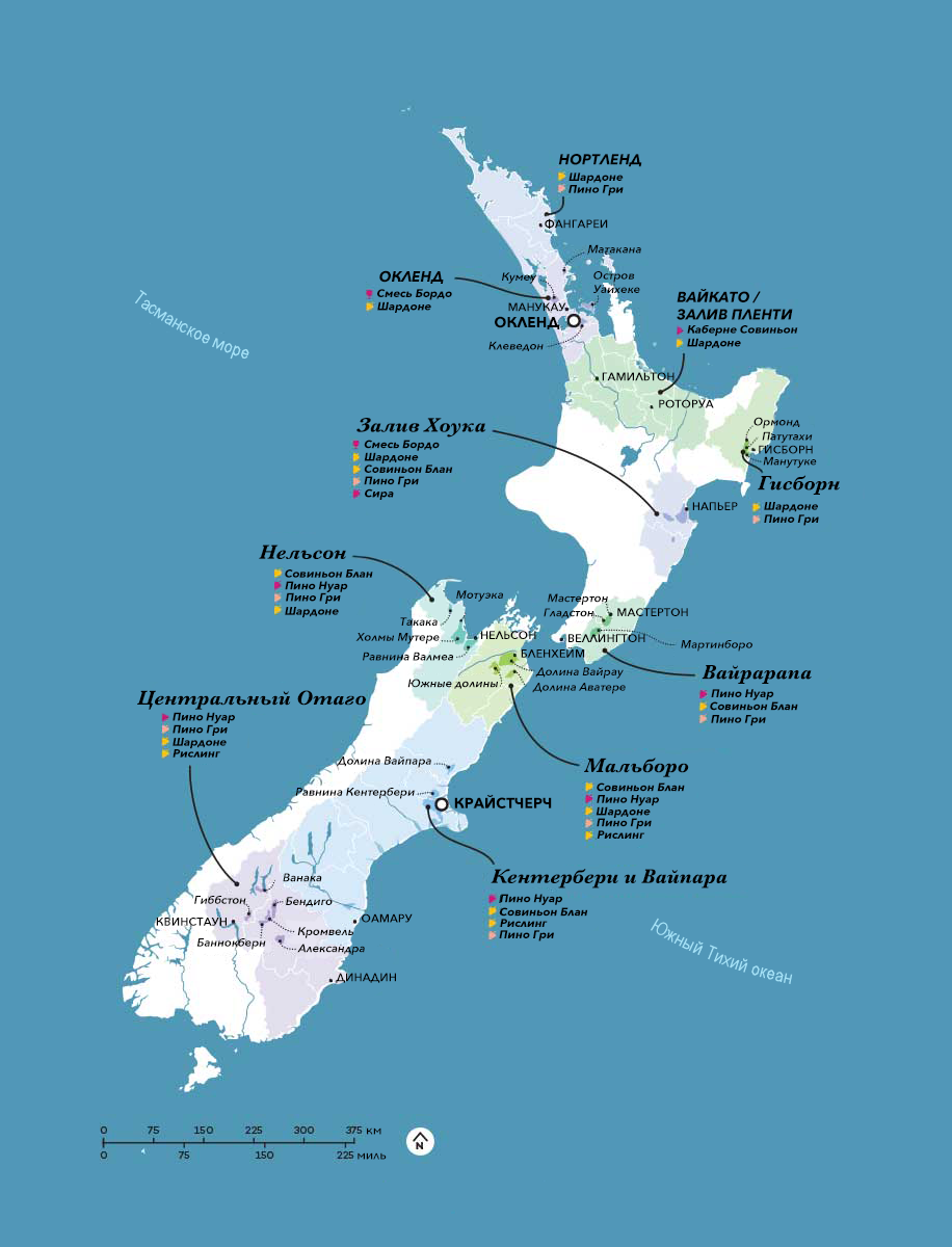 Узнайте о скрытой жемчужине южной части Тихого океана. В Новой Зеландии есть 10 винодельческих регионов, разбросанных по основным островам, где производятся заслуживающие внимания вина Совиньон Блан и Пино Нуар. САМАЯ ЗЕЛЕНАЯ ВИННАЯ СТРАНА Новая Зеландия считается «мировой столицей Совиньон Блан» с почти 20 000 га земли, засаженных по всей стране. В целом, Новая Зеландия производит отличные сорта для прохладного климата, включая Совиньон Блан, Шардоне, Рислинг, Пино Нуар и Пино Гри. Что интересно, так это беспрецедентная приверженность Новой Зеландии устойчивому развитию. На сегодняшний день 98% виноградников соответствуют стандарту устойчивого развития ISO 14001, а 7% работают органически. Это немалый подвиг, учитывая, что в прохладном климате труднее быть органичным. ВИННЫЕ РЕГИОНЫ Более прохладные регионы Мальборо, Нельсон и Вайрарапа производят Совиньон Блан с ароматами маракуйи и такой высокой кислотностью, что нередко можно увидеть остаточный сахар, даже если вы не можете его поп