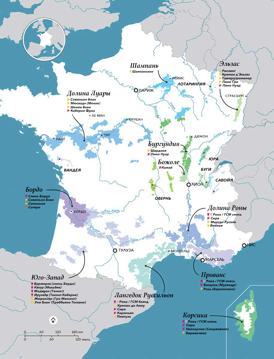 Винные регионы Францию можно разделить на 11 основных винодельческих регионов, которые охватывают самые разные климатические условия и территории. Некоторые регионы более известны, чем другие, благодаря размеру производства или широкому распространению и влиянию. Возможно, самыми влиятельными (и известными) регионами Франции являются Бордо, Бургундия, долина Роны, долина Луары и Шампань.
