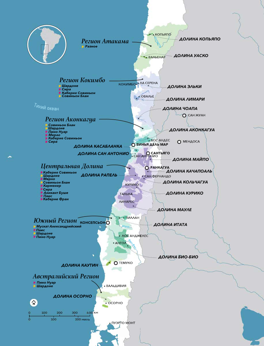 Чили представляет собой тонкую полоску земли, зажатую между Тихим океаном и Андами. Расположение страны создает массивный эффект кондиционера — всасывание прохладного океанского воздуха внутрь суши. Каждый винодельческий регион имеет 3 уникальные зоны выращивания: Костас (более прохладные прибрежные районы), Энтре-Кордильеры (теплые внутренние долины) и Лос-Андес (открытые горные районы).