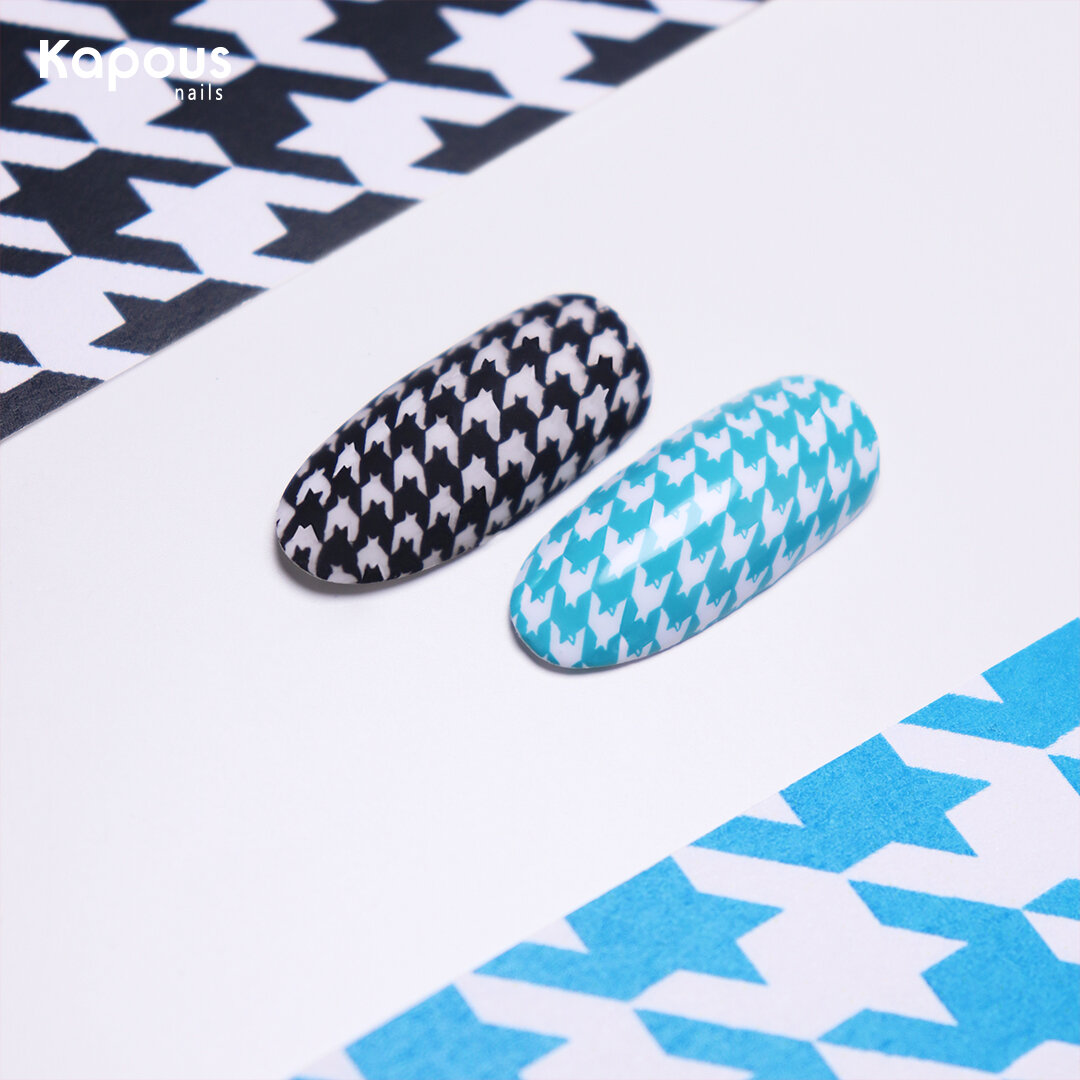Стемпинг «Crazy Story» — настоящая гордость направления Kapous Nails, ведь он позволяет превратить обычный маникюр в произведение искусства. А еще дает возможность почувствовать себя экспертом моды, ведь в ассортименте есть узоры, которые соответствуют актуальным принтам в одежде и аксессуарах. Вооружившись пластиной Geometry 3, наши технологи предложили примерить тканевые принты, которые никогда не выходят из моды. Гусиная лапка Биография узора «Гусиная лапка» или pied-de-poule насчитывает несколько столетий и берет начало в шотландской прядильной традиции, а вот ее модное восхождение случилось благодаря Коко Шанель. В 20-годах XX-го века легендарный модельер перенесла классический паттерн на свои элегантные костюмы и сделала «Гусиную лапку» символом роскоши и исключительной элегантности. Вы можете отдать предпочтение черно-белому варианту или же добавить ярких красок с лаком для стемпинга в бирюзовом оттенке. Гленчек В классическом прочтении клетка «Гленчек» представляет собой про