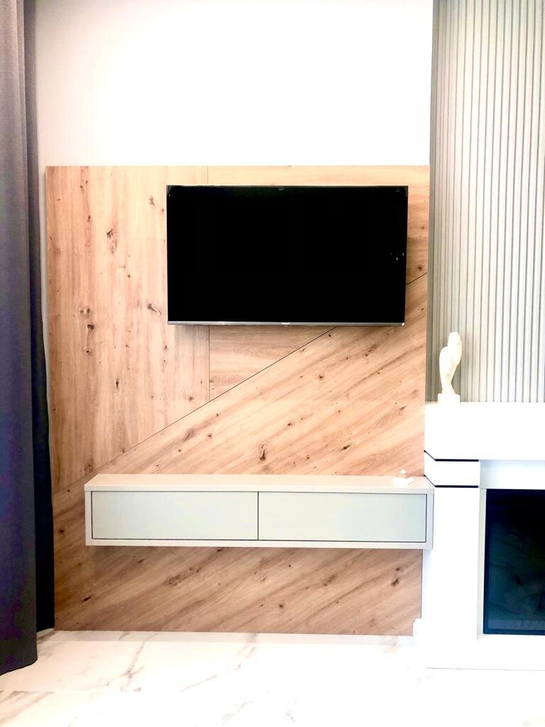 Автор проекта – дизайнер Олеся Медведева Одна из специализаций нашей компании – комплексная меблировка интерьера. Работа с проектом этой 68-метровой квартиры началась с прихожей. Заказчики обратились с просьбой спроектировать мебельную композицию, где есть шкаф, консоль, зеркало во входной зоне. Наш дизайнер прорисовал несколько вариантов и, так как пространство позволяло, добавил на визуализациях высокие комоды для обуви. Заказчикам эта идея понравилась, и они решили прорисовать меблировку других пространств. В комнате Выполняющей роль кухни-гостиной, мы спроектировали ТВ-зону: древесное панно в качестве подложки под экран и узкую консоль; В детской Шкаф, комод, письменный стол с подвесной полкой и напольную полку с мягким сидением; В спальне Гардеробную, прикроватные тумбочки, косметический столик и стильный стеллаж с консолью и подложкой для ТВ, В санузле Навесной шкафчик с зеркалами и тумбу под раковину. Вся мебель выполнена в единой цветовой гамме. Дизайнер предложил использовать