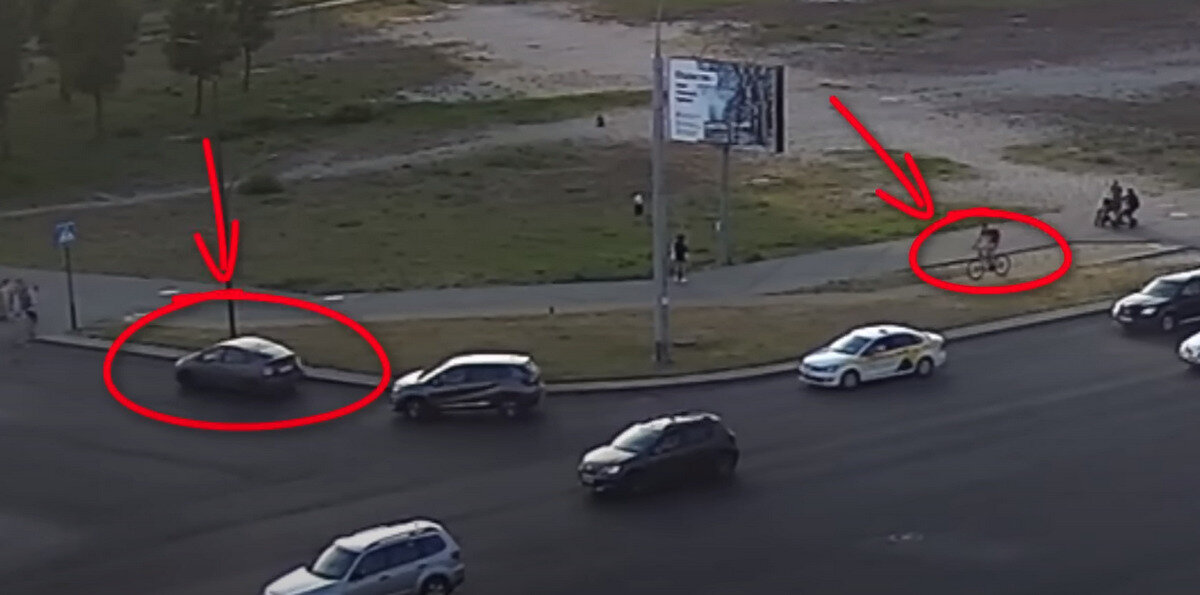 В какой-то момент, пешеходный переход освободился, и подъехавший автомобиль продолжил движение, но тут, на огромной скорости на дорогу выехал велосипедист.