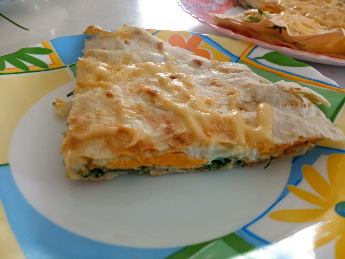 С завтраком я дольше 20 минут не вожусь. Дежурные рецепты - каша, вафли, омлет. Оладьи - если с вечера поставила дрожжевое тесто. Могу разморозить сырники, часто выручают. Но в своё время открытием для меня стал именно этот рецепт. Готовится элементарно, а выглядит шикарно. По времени готовится чуть дольше яичницы. По вкусу её превосходит. Это очень сытный завтрак, одного такого нам хватает на семью. Если дома найдётся лист лаваша, яйца, сыр, то готовим.... 🍽ПИРОГ ИЗ ЛАВАША НА СКОВОРОДЕ 🔸Из армянского лаваша ножницами вырезаем 2 окружности диаметром равным дну сковородки. На сковороду капаем растительного масла, кладём 1 кружок лаваша. 🔸разбиваем 4 яйца и аккуратно выливаем на лаваш. Солим, накрываем крышкой. 🔸когда яйца схватятся, посыпаем их тёртым сыром и укропом. По желанию добавляем ветчину, перец, лук. Накрываем другим кружочком лаваша. 🔸теперь внимание! Надо перевернуть. Сделать это получится с помощью большой плоской тарелки. Наклоняем сковородку так, чтобы на