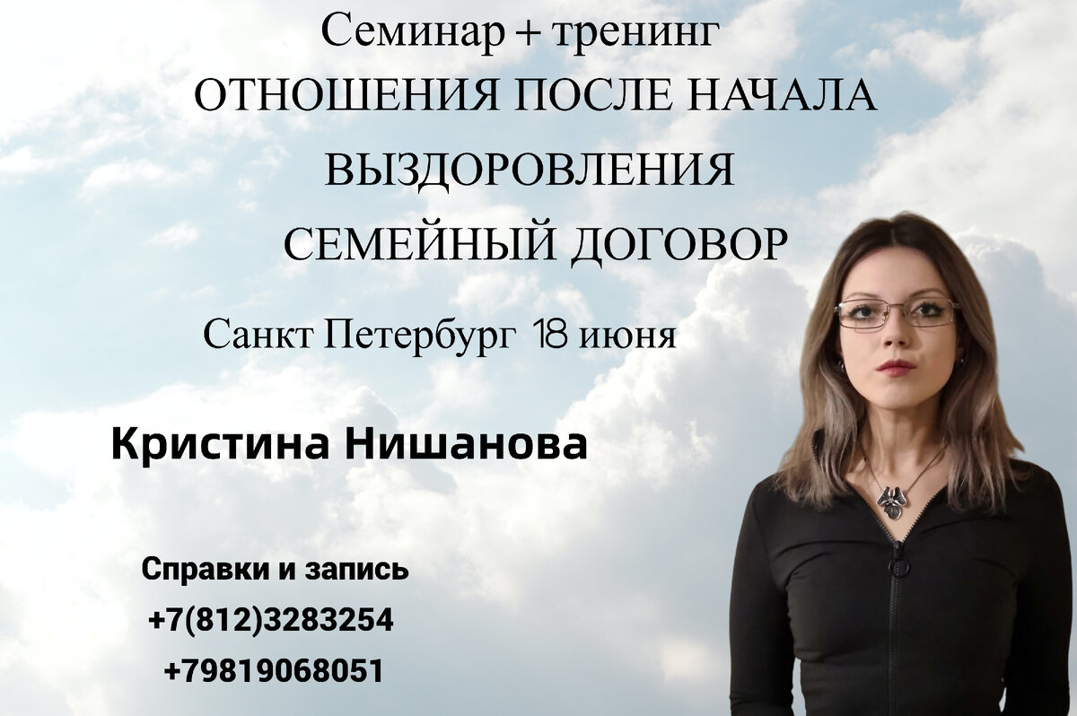 ❗❗❗ Уважаемые друзья❗❗❗ Мы рады пригласить вас на семинар-тренинг по теме ⚠Отношения после начала выздоровления, семейный договор⚠ , который пройдет 18 июня в Санкт Петербурге , начало 16:00(Возможно участие через ZOOM) На этом семинаре вы узнаете: ✅Как может поменяться поведение зависимого ✅Что вам не следует делать в общении с зависимым ✅Как вы можете поддержать зависимого в процессе выздоровления ✅Вы узнаете различные техники и стратегии , которые помогут вам стать более уверенным и эффективным в общении с зависимым ✅Кроме того, участники семинара получат возможность практически применить новые знания в интерактивных упражнениях и ролевых играх, которые помогут улучшить навыки коммуникации и повысить уверенность в себе. ✅При желании участники получат сертификат об участии в семинаре по который может быть использован для продвижения в карьере или для дополнения своего профессионального портфолио. 📌Мы гарантируем, что этот семинар станет для вас ценным опытом, который поможет вам ста