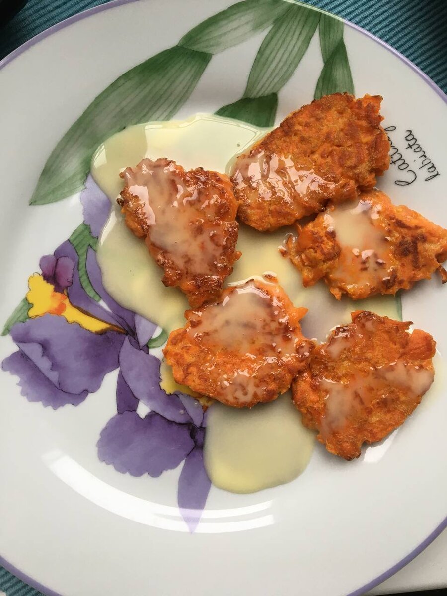 Чудесное и простейшее блюдо. Морковь я тоже выращиваю сама ! Среднюю, помытую морковь отварить 30-40 минут. Очистить и натереть на терке . Добавить яйцо , соль , манку . Тщательно перемещать. На горячей сковороде разогреть растительное масло , столовой ложкой выкладывать оладьи , после переворачивания продолжать жарить под крышкой . Подавать со сгущёнкой Ингредиенты: на 5-6 штук моркови , одно крупное яйцо, 2-3 ложки манки , соль на кончике чайной ложки .