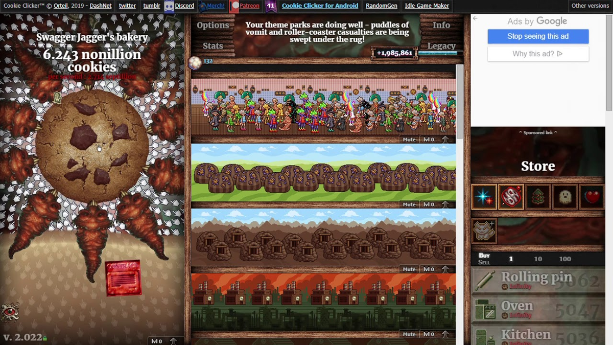 Краткое (или не очень хз) описание куки кликера его особенностей и конечно же моё никому не нужное мнение. Я обычный игрок расскажу вам об этой прекраснейшей игре Об игре В этой игре нам предстоит кликать на печенье, покупать здания которые производят печенье, покупать улучшения для того что бы делать больше печенья за клик(Cookie per click, cpc) или печенья в секунду(Cookie per second, cps), но это только начало. Позже бабушки обозлятся и будут забирать наши cps. Также можно сбросить всё печенье для покупки более мощных улучшений(Конечно же ради еще большего кол-ва печенья) Улучшения за печенье Есть следующие виды улучшений: 1. Улучшения кликов Улучшения кликов, как ни странно, улучшают кол-во печенья выпекаемого за клик. Они могут просто увеличить cpc, увеличить его за счет количества зданий, увеличить за счет текущего cps. 2. Улучшения зданий Не считая бабуль и курсоров, они просто удваивают cps. Улучшения бабушек не просто удваивают, а еще и увеличивают эффективность других зданий