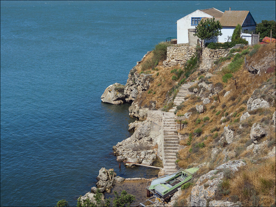 А, вскарабкавшись вверх, снова зашагали над бухтами, и в конце концов вышли к руинам базы отдыха «Энергодар». Когда-то она была велика, сейчас же асфальт её площадей осыпается в пропасть, зарастает лохами, а утопающие в травах домики зияют выбитыми окнами. Здесь тоже есть уютная бухточка, к которой даже ведёт сохранившаяся дорожка, но мы решили туда не спускаться, чтобы потом не ломать ноги в прибрежном каменном хаосе. В прошлом году Андрей уже пытался его преодолеть — не понравилось. Так что мы через территорию ешё одной заброшки — бывшей базы «Ласточка» — направились прямиком в Широкую бухту. Над её пляжем, кстати, жизнь вполне заметна — по склону бухты раскиданы вполне аккуратненькие, явно обитаемые в сезон домики базы отдыха «Волна». Украшает берег белая, модно-типовая ныне ротонда, а вниз, к морю, ведёт длинная каменная лестница. По ней мы торжественно спустились на пляж.