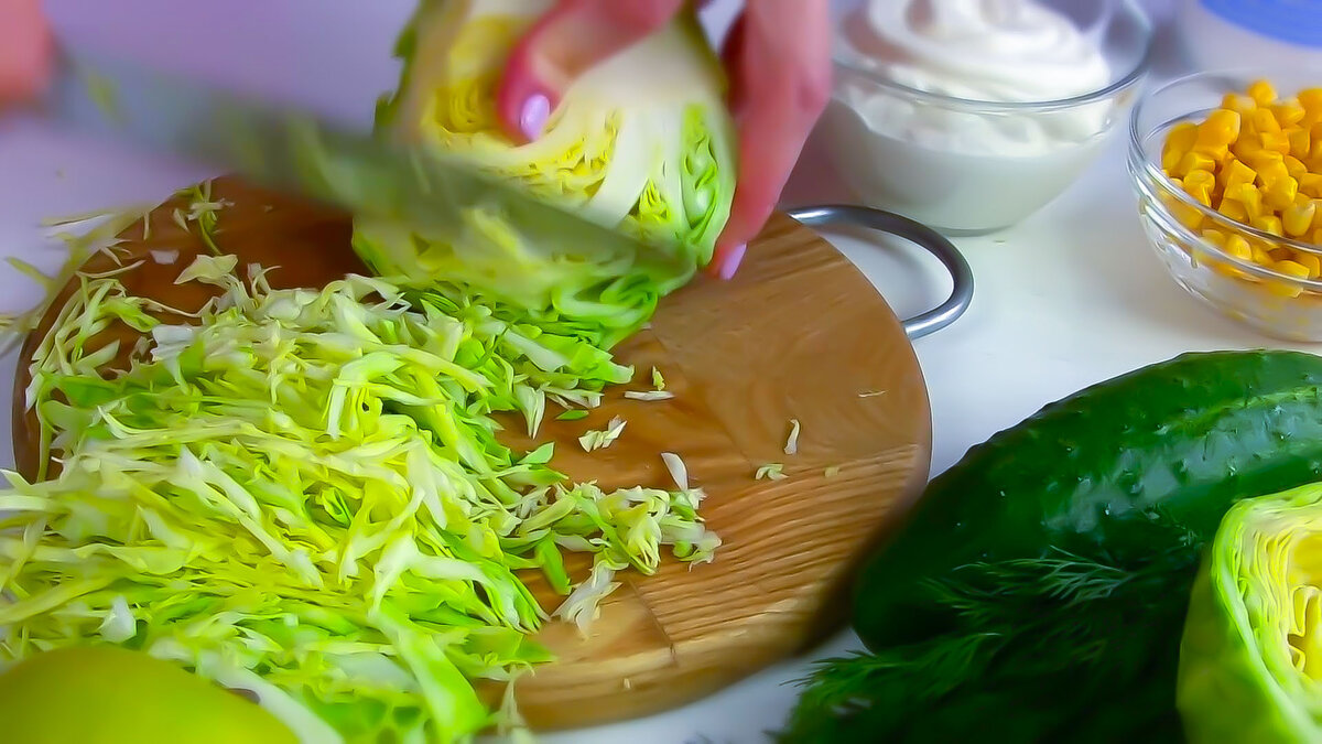 Всем привет! Меня зовут Елена и я рада Вас приветствовать на своём канале. Сегодня я хочу предложить приготовить два простых салата с капустой. Рецепты простые и быстрые на каждый день. Готовим салаты: Берём молодую капусту 400г и нарезаем соломкой и отправляем в миску. Свежий огурец нарезаем соломкой и отправляем в миску. 1 зелёное яблоко очищаем от кожуры и так же нарезаем тонкой соломкой. Поливаем лимонным соком 1 ст.л. и отправляем в миску. Далее нарезаем мелко укроп и добавляем в салат. Консервированная кукуруза 100 г. Соль, чёрный молотый перец по вкусу и заправляем сметаной. Второй салат. Нарезаем молодую капусту 400г соломкой. Далее нарезаем огурец 1-2 шт. соломкой и отправляем в миску. Далее нарезаем несколько веточек кинзы и укропа и добавляем в салат. Яйца варёные 4 шт. Отделяем желтки от белков. Белки нарезаем соломкой и отправляем в салат. Желтки разминаем в мисочке, добавляем соль, чёрный перец, растительное масло 2-3 ст.л., горчица 1-2 ч.л., сметана 3 ст.л. Всё перемеши