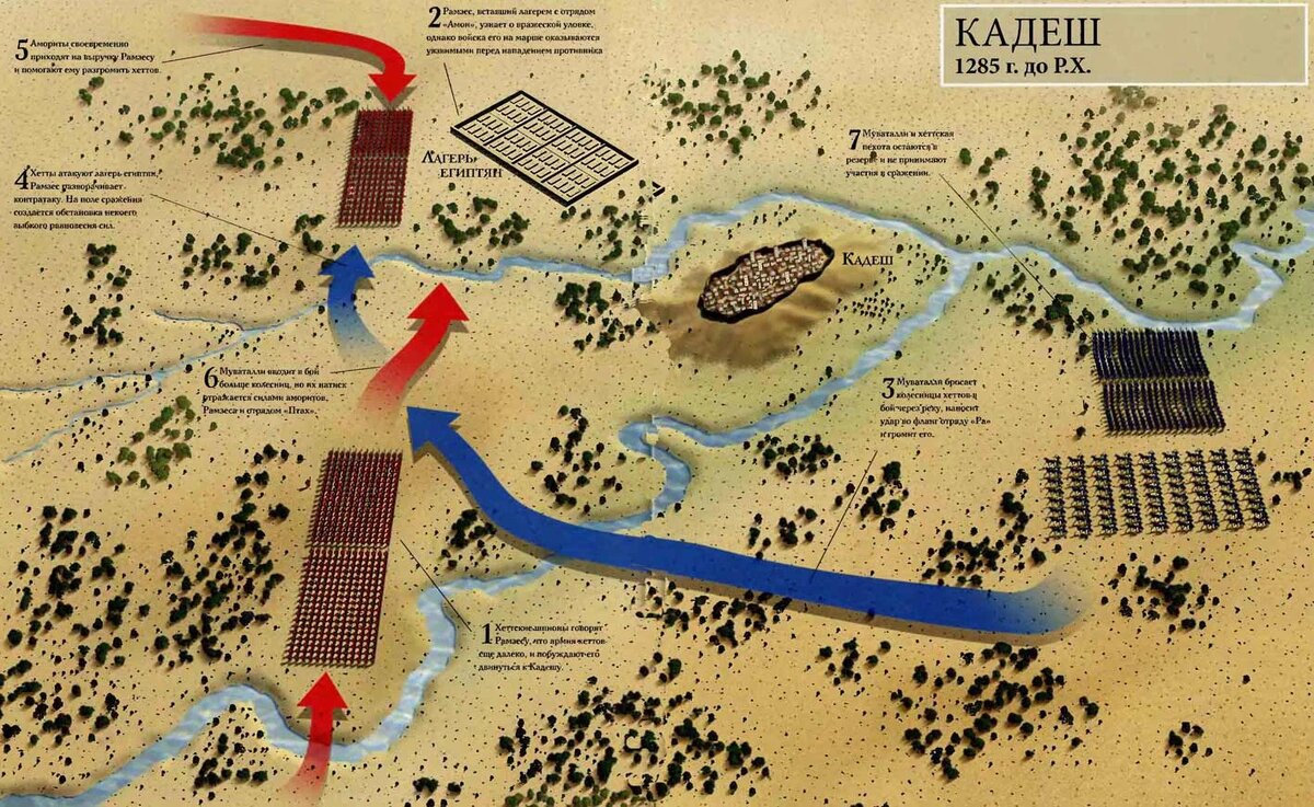 В мае 1284 г. до н.э. египетская армия наконец приблизилась к Кадешу – этой огромной крепости, построенной на левом берегу Оронта, у выхода в долину Бекаа. Крепость стояла на границе Хеттской империи и служила отправной точкой отрядов, совершавших набеги на Амурру и Ханаан – египетские владения.