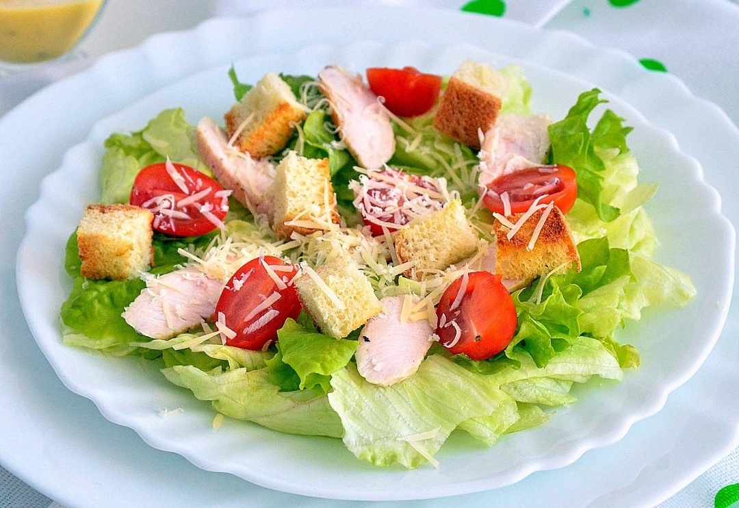 Цезарь – всемирно известный салат, существующий в различных вариациях. Кто-то готовит его без помидоров, а кто-то с яйцами. Мы предлагаем вам не классический, но очень вкусный рецепт данного салата. Ингредиенты: Для салата вам понадобится: Салат Айсберг / Романо – 350 г. Помидоры черри – 8 шт. Куриное филе – 300 гр. 1/2 батона Зубчик чеснока Пармезан – 100 г. Растительное масло 1 ст. л. Соль, перец по вкусу. Для соуса вам понадобится: Пармезан – 20-30 г. Оливковое масло – 50 мл. Горчица – 1 ст. л. Яйцо – 1 шт. Сахар – 1 ч. л. Соль – 1/2 ч. л. Зубчик чеснока Способ приготовления: 1. Обмажьте куриное филе солью и молотым перцем. 2. Смажьте сковороду несколькими каплями растительного масла. Обжарьте куриное филе с каждой стороны до румяной корочки. 3. Нарежьте хлеб на небольшие ровные кубики. Жарьте гренки (до хрустящего состояния) на смазанной маслом сковороде с добавлением пары зубчиков чеснока. 4. Для соуса смешайте в глубокой таре сырое яйцо, соль, сахар, горчицу, измельчённый чесн