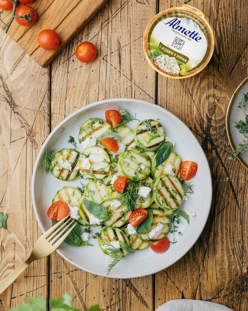 Пришло время бросить вызов мангалу! Поэтому тема нашей подборки — гриль. Здесь вы найдёте мясные и овощные рецепты с дымком. А знаете, что их всех объединяет? Конечно, воздушный Almette. Выбирайте любимый вкус творожного сыра и смело добавляйте его в качестве соуса к мясу или в салат. Салат из кабачков на гриле Молодые кабачки можно есть даже сырыми, но мы предлагаем приготовить их на гриле. Ловите простой рецепт из продуктов, которые всегда под рукой. Almette для такого салата подойдёт как нельзя лучше, его нежная текстура отлично сбалансирует вкус овощей. Ингредиенты: • Цукини/кабачок – 2 шт.