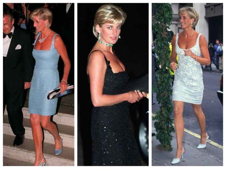 Темно – синее платье с сапфировым колье – чокером для церемонии вручения наград CFDA Awards в 1995 году. Голубое платье – миди на спектакле «Лебединое озеро» в королевском Альберт – Холле в 1997 году. Красное длинное платье на мероприятии по сбору средств для детей в Харроу в 1997 году – это вариации одного фасона сарафана на бретелях, которые Диана носила, чтобы подчеркнуть свою фигуру.