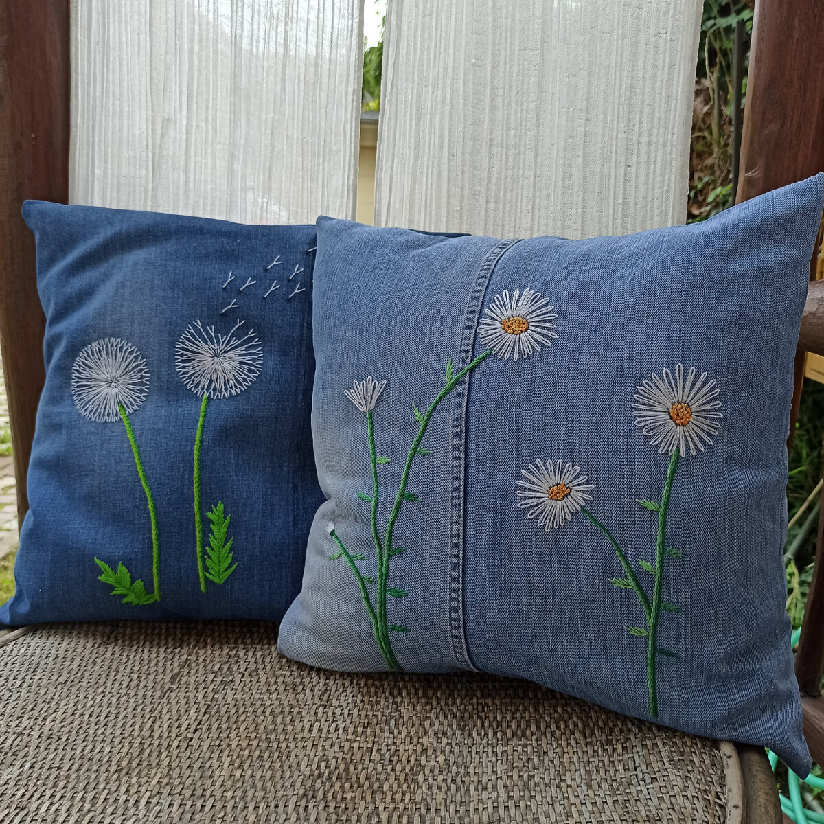 Итак, декоративная наволочка готова! Можно приступать к вышивке. Как сшить подушку если у Вас нет готовой можно посмотреть здесь и здесь. В этой статье я поделюсь своим опытом вышивания ромашек. В предыдущей рассказывала про одуванчики. Прочитать ее можно здесь. Начинаем с эскиза. И подбора ниток Я начинаю с вышивки стебля. На наволочке простым карандашом намечаю стебель. Остальные элементы вышивки - как рука ляжет Стель вышиваю простым тамбурным швом И использую тот же прием, что и при вышивке одуванчика - дублирую стебель еще двумя цветами Далее вдоль стебля появляются листики. Цвета листиков выбраны хаотично. Если честно, я просто вышивала очередной листик ниткой того цвета, которая была в иголке )) Далее приступаем к ромашке. Начинаю с сердцевины. Ее можно вышить нитками одного цвета, а можно сделать бленд - соединить нити двух или более цветов. Тогда получится довольно интересный эффект. Сердцевину ромашки заполняем французскими узелками Вокруг сердцевины "вырастают" белые л