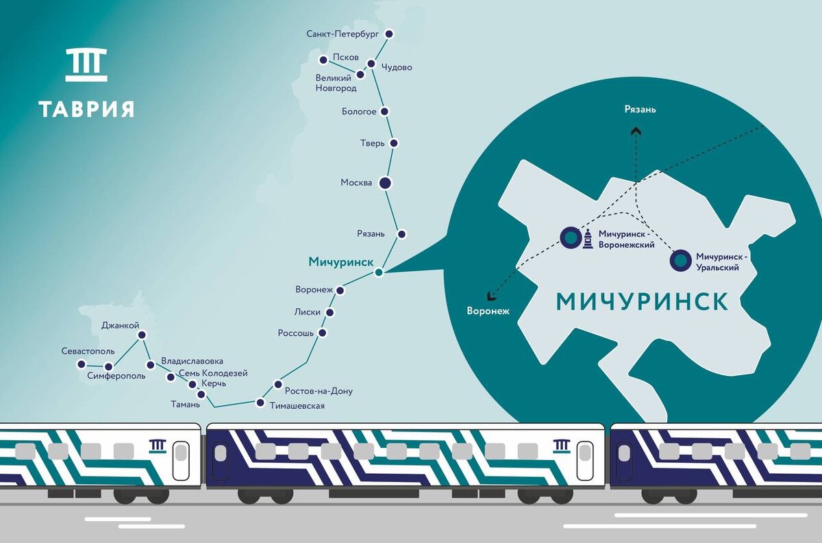 Все наши поезда из Москвы и Петербурга останавливаются в городе Мичуринск Тамбовской области. Это очень интересный город с железнодорожной точки зрения, потому что здесь находятся сразу две станции – Мичуринск-Воронежский и Мичуринск-Уральский. На станции Мичуринск-Воронежский останавливается большинство наших поездов, которые едут из Москвы и Петербурга в Крым. Это обычная станция, где поезд стоит, как правило, не больше пяти минут.