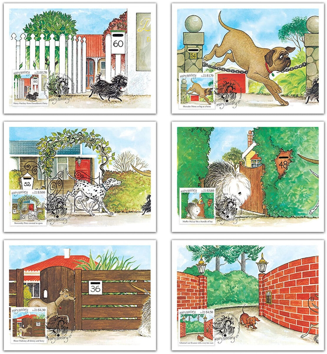 Волосатый Маклари (Hairy Maclary) - вымышленный пес, герой серии детских книг с картинками, созданного в Новой Зеландии автором Линли Додд (Lynley Dodd). Первое появление состоялось в 1983 году с публикации Волосатый Маклари из молочной компании Дональдсона (Hairy Maclary From Donaldson’s Dairy). Волосатый Маклари является главным героем серии из двенадцати книг. Было продано более пяти миллионов копий по всему миру. Приключения Волосатого Маклари обычно происходят в компании других его друзей-собак, среди которых такса Шницель фон Крамм, далматинец Боттомли Поттс, борзая Битцер Мэлони, английский мастиф Геркулес Морс и английская овчарка Маффин Маклей. В сериале также представлены коты Scarface Claw, их грозный противник и Слинки Малинки. Выпуск блока посвящен Международной выставке марок NZ2023 в Новой Зеландии.