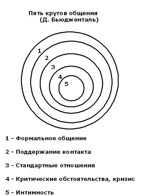 В самом центре он расположил интимность - тот вид общения, к которому осознанно или неосознанно стремимся практически все мы. Иногда нам удается уловить этот миг интимности, быстро исчезающий в повседневной суете. Кто-то так никогда и не ощутил подлинно близкого общения. Д.Бьюдженталь объяснил, что это происходит потому, что для того, чтобы достичь ощущения интимности в общении с другим человеком, нужно преодолеть еще 4 уровня, или круга общения.
