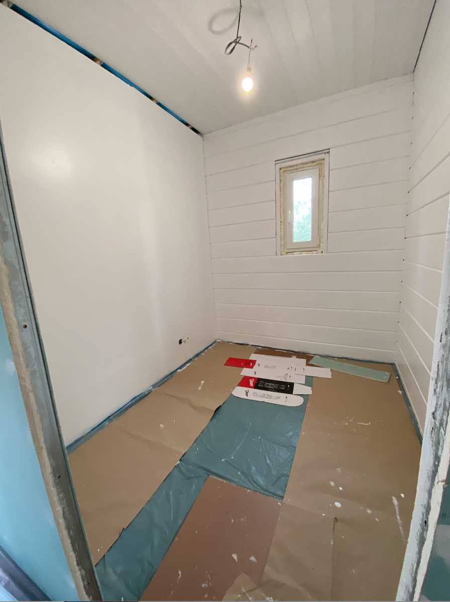 В качестве временного решения вместо плинтусов проклеили стыки пола и стен самоклеящейся белой бордюрной лентой (листайте!).