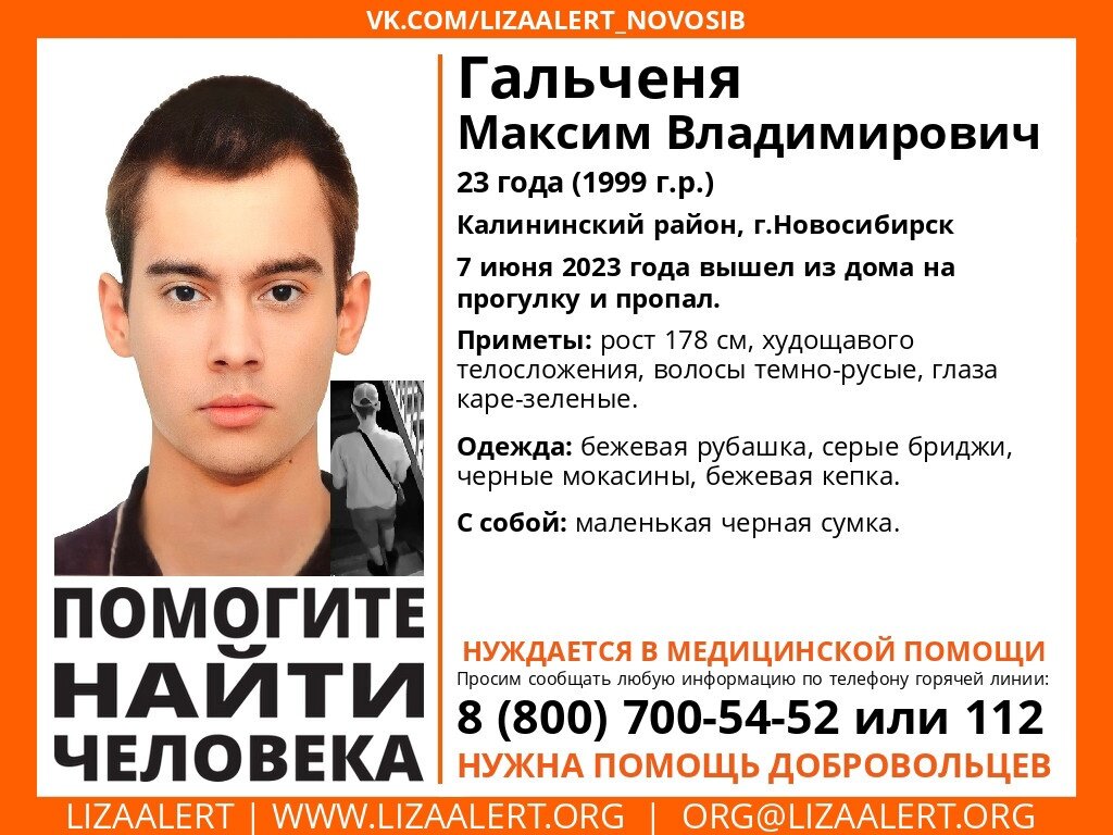 Фото: «ЛизаАлерт» В Новосибирске не могут найти 23-летнего Максима Гальчиню. Как сообщили волонтёры поисково-спасательного отряда «ЛизаАлерт», парень вышел на прогулку 7 июня и после не вернулся домой. Молодой человек пропал в Калининском районе. Приметы пропавшего: рост 178 см, худощавое телосложение, каре-зеленый цвет глаз, темно-русые волосы. Парень был одет в бежевую рубашку, серые бриджи и черные мокасины, на голове была бежевая кепка. Уточняется, что он взял с собой небольшую черную сумку. Если у вас есть информация о местонахождении Максима Гальчини, сообщите об этом по телефону ПСО «ЛизаАлерт» 8-800-700-54-52 или наберите 112. Ранее мы писали, что пропал 74-летний житель Бердска. Александр Калугин
