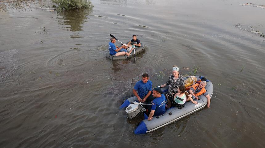 ВСУ даже после подрыва плотины продолжают обстрелы. Фото: Алексей Коновалов / ТАСС; 5-tv.ru В Новой Каховке уровень воды сегодня снизился больше чем на полметра, а в Каховском водохранилище — на три с половиной. Однако ситуация все еще очень сложная, около сотни человек остаются в городе. Желающих покинуть свои дома вывозят. Всего в зоне бедствия 15 населенных пунктов, а это порядка 40 тысяч человек. Тем временем, ВСУ даже после подрыва плотины продолжают обстрелы. С беспилотника они сбросили самодельное взрывное устройство на спасателей, которые помогают людям. С последней информацией из Новой Каховки — Эмиль Тимашев.
