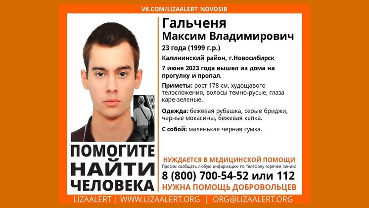 В Калининском районе Новосибирска без вести пропал 23-летний Максим Гальченя. По данным поисково-спасательного отряда (ПСО) «ЛизаАлерт», молодой человек отправился на прогулку 7 июня 2023 года, однако домой так и не вернулся. Приметы пропавшего: рост 178 сантиметров, худощавое телосложение, волосы темно-русые, глаза каре-зеленые. В день исчезновения был одет в бежевую рубашку, серые бриджи, черные мокасины и бежевую кепку. При себе имел маленькую черную сумку. Если у вас есть информация о местонахождении юноши, сообщите об этом по телефону ПСО «ЛизаАлерт» 8-800-700-54-52 или наберите 112. Ранее «Вести Новосибирск» рассказывали, что в Бердске без вести пропал 74-летний Алексей Чибиряк. Как сообщили волонтеры, пожилой мужчина 7 июня 2023 года ушел из дома в неизвестном направлении.