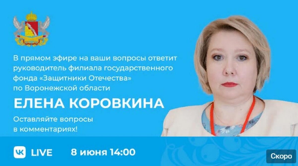 Сегодня, 8 июня, на вопросы подписчиков в прямом эфире ответит руководитель филиала государственного фонда «Защитники Отечества» по Воронежской области Елена Коровкина.