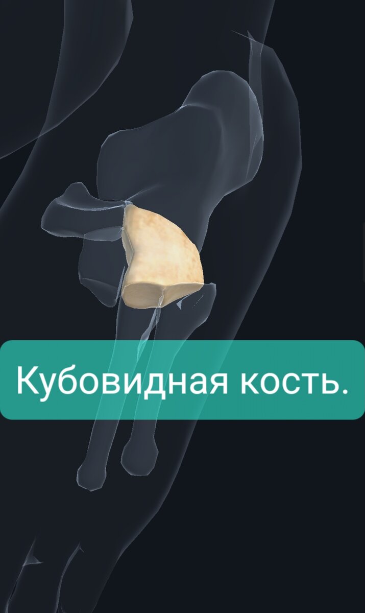 Единственная кость дистально-латерального отдела предплюсны. Задняя часть прилежит к пяточной кости, медиальная - к ладьевидной и латеральной клиновидной, а передняя сединяется с четвертой и пятой плюсневыми костями. На поверхности кубовидной кости располагаются суставные поверхности для соединения с соседними костями: На нижнелатеральной поверхности ккбовидной кости (это самый внешний край стопы) находится вырост - бугорок кубовидной кости, он ограничивает сзади борозду сухожилия длинной малоберцовой мышцы. В этой борозде, как можно догадаться, проходит сухожилие длинной малоберцовой мышцы (крепится оно дальше, на клиновидных и плюсневых костях), но кубовидную кость оно поддерживает снизу, препятствует (в меру силы своей мышцы) опусканию её вниз. Это ещё одно сухожилие, входящее в состав "стремени", поддеживающее свод стопы. В районе этой борозды сухожилие сильно трётся и давит на кубовидную кость. Чтобы это давление скомпенсировать, тут присутствует синовиальная сумка, которая уме