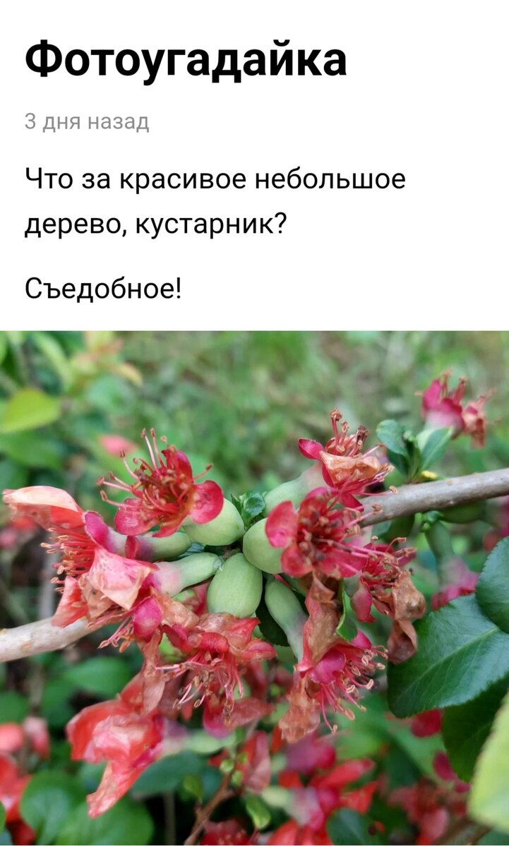 Не стала больше ждать правильных и неправильных ответов на фотозагадку. Правильный ответ- японская айва. Хочу себе такую, так как рекомендует подруга. Подходит для нетеплого Подмосковья.