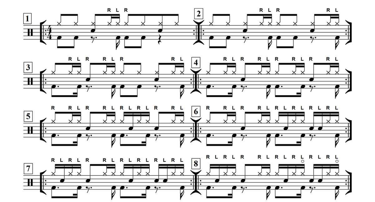 Вот, вам 8 интересных грувов, которые включают дополнительный удар в хай-хет каждый раз, когда бас барабан играет на четвертую шестнадцатую в четверти.