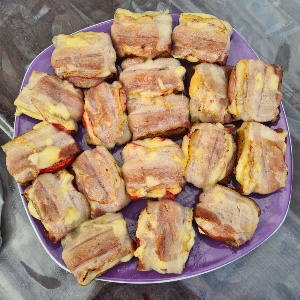 У меня все соцсети заполнены рецептом этих бутербродов, и всё было так аппетитно, что нельзя не попробовать. Сразу говорю, экспериментировала по разному. Расскажу как готовила и что потом меняла) Но закуска просто чистый кайф, я не ожидала что такое простое получится таким вкусным. Готовим. Берем чёрный хлеб, нарезаем его. Затем берём чеснок, тоже нарезаем его тонкими круглешками. Я делала два вида. Один с ветчиной, другой с помидоркой. Режем их и выкладываем. Также режем сыр и выкладываем и его. Затем берём бекон и обворачиваем наши бутерброды. На 1 бутерброд у меня уходило 2 полосочки бекона. Затем выкладываем на решетку. У меня получилось 4 бутерброда с ветчиной, 4 с помидоркой и 3 я сделала с белым хлебом (половинки белого хлеба, и в них я положила и ветчину и помидор). Дальше жарим на мангале буквально по 2 минуты с каждой стороны, бекон поджарится, сыр подплавится, остальное просто подогреется. Какой же аромат был, пахло всем, особенно вкусно чесноком))) Сняли и пробовали по