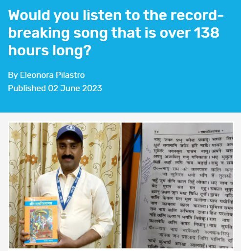 Джагадиш Пиллаи из Индии решил попасть в книгу Гиннеса и выпустил трек, длинной в 138 часов, 41 минуту и 20 секунд. Речь идет о композиции, которая основана на эпической поэме «Рамачаритаманаса» («Океан деяний Рамы»). Это памятник индуистской литературы, состоящий из более чем 15 тыс. стихов. В результате получился трек длиной 138 часов 41 минута и 20 секунд – почти шесть суток. При этом запись трека заняла у индийца больше четырех лет. Поэма написана на диалекте авадхи, который принадлежит к языковой семье хинди. Она основана на широко известной Рамаяне и повествует о деяниях легендарного аватара Вишну Рамы. Рекорд был поставлен в городе Варанаси, который выделяется как духовный центр приверженцев индуизма. Огромный Маленький Мир