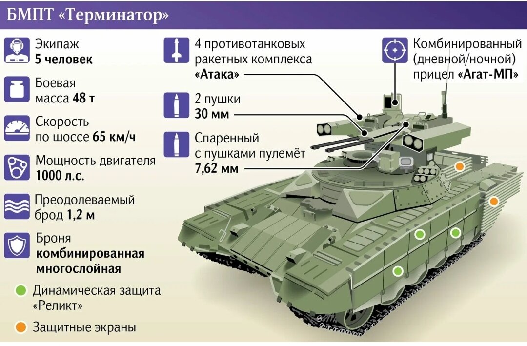 Российская боевая машина поддержки танков, предназначенная для действий в составе танковых формирований с целью поражения противотанковых средств противника. Оснащена гранатомётами, противотанковыми комплексами, стрелковым оружием, есть также возможность поражать на ходу и с места танки, БМП и другие высокозащищенные цели. Разработка машины, которую теперь выпускает " Уралвагонзавод ", началась ещё в середине 1980-х. Первый вариант был создан на базе танка Т-72 А , а шасси от более продвинутого Т-90 задействовали в конце следующего десятилетия . Терминатор вооружили 30 миллиметровой пушкой, затем добавили ещё одну , сделав машину более грозной. В боевых условиях машину испытывали летом 2017 года на Сирийской земле, где " Терминаторы " успешно противостояли террористам. БМПТ нужны, чтобы защищать танки, позволяя основной ударной силе сосредоточиться на главной задаче. Кроме того, отечественная БМПТ отлично приспособлена для ведения боя в городских условиях .