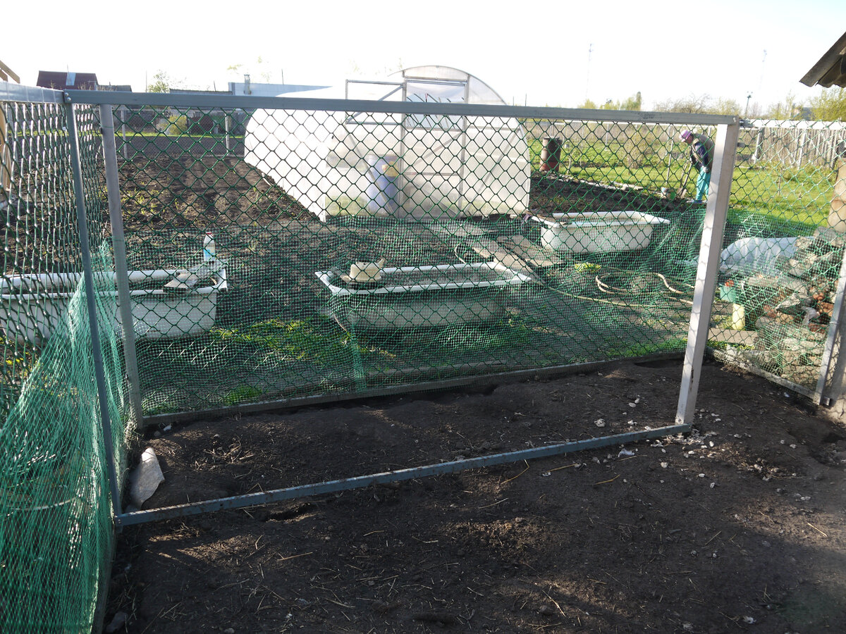 Мы отделили кусок территории шириной около метра. Этого вполне достаточно для 10 бройлеров. Если птиц больше, соответственно, ширину надо увеличить. На лаги повесим сетку Рабица, закрепив её пластиковыми хомутами.