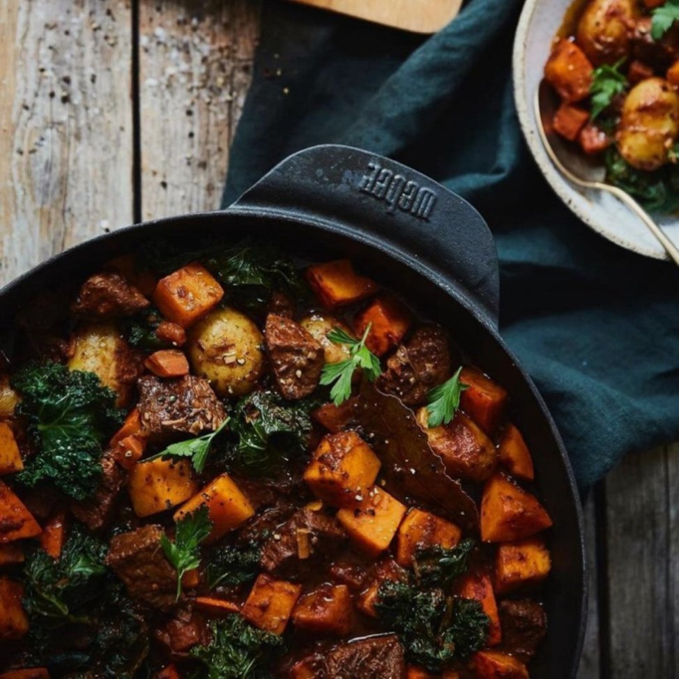 Друзья, приветствую вас на своем канале. На улице настоящая весна, а это значит, что пользоваться грилем и готовить вкуснейшие блюда на нем можно чаще и чаще. А еще гриль – это повод собрать большую компанию друзей и угостить их вкуснейшими блюдами. Как думаете, чем вкусно и сытно накормить большую компанию? Правильно! Мясом! И не просто мясом, а я говядиной с овощами. Итак, приступим и начнем с ингредиентов. Нам понадобятся: - 1 кг говядины; - 6 столовых ложек растительного масла; - 2 луковицы; - 3 зубчика чеснока; - имбирь; - 2 моркови; - половина тыквы; - по 200 грамм картофеля и капусты; - 2 столовые ложки томатной пасты или пюре; - 1 литр мясного бульона; - протертые помидоры примерно 200-250 мл; - 2 ст. ложки муки; - прованские травы; - лавровый лист; - петрушка. Итак, приступим к приготовлению Мясо нарезаем кусочками размером примерно 2,5 на 2,5 см и смешиваем его с 3-мя столовыми ложками масла. Очищаем и мелко нарезаем лук, чеснок и имбирь. Морковь и тыкву и очищаем и нарезаем