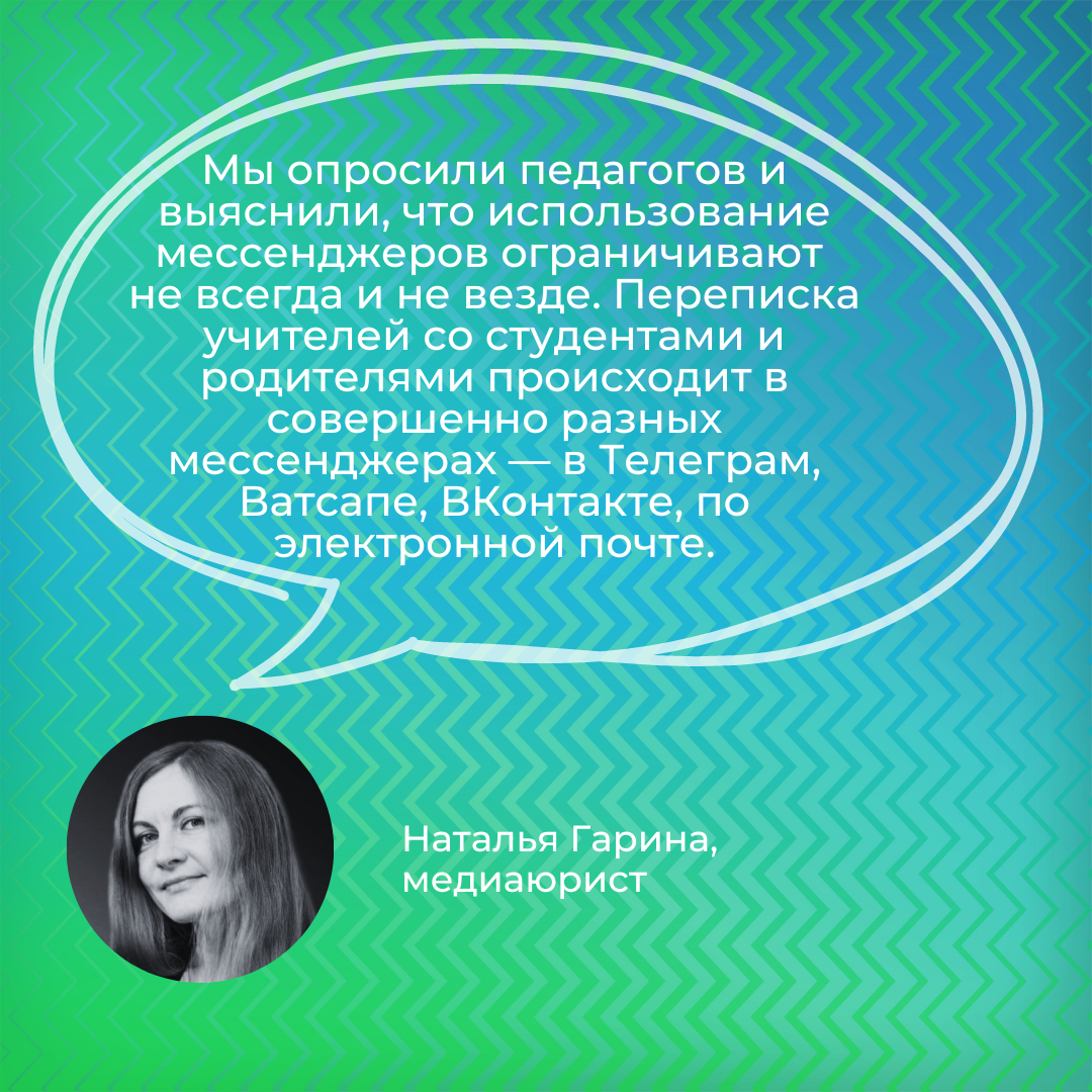 Государственным организациям, в том числе школам, колледжам и вузам, запретили пользоваться иностранными мессенджерами. Но паниковать пока не стоит — запретили не всё и не всем. Как теперь пользоваться мессенджерами, объясняет медиаюрист Наталья Гарина. Для педагогов ничего не изменилось. Они по-прежнему могут общаться с родителями и учениками в удобных для них мессенджерах. В отношении школ нельзя говорить, что вообще однозначно запретили пользоваться иностранными мессенджерами. Есть рекомендации Министерства просвещения, но они касаются только работы государственной системы «Моя школа» и её компонентов, то есть предназначены для учителей. Рекомендации, как им и положено, носят рекомендательный характер, и решения принимаются на местном уровне. В «чёрный список» попали девять мессенджеров: Образовательным учреждениям запрещено их использовать для передачи персональных данных; данных о денежных переводах; сведений, необходимые для осуществления платежей и о счетах и вкладах в банках.