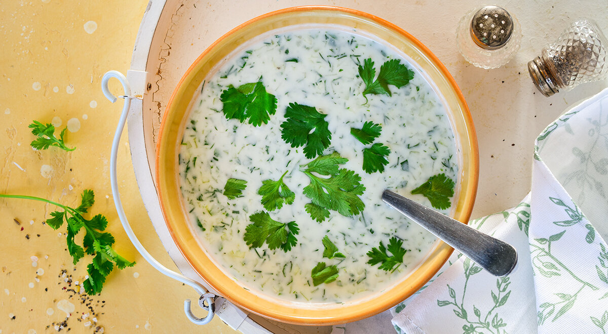 Армянская окрошка (мацнабрдош) — освежающий вегетарианский холодный суп на основе армянского кисломолочного продукта мацун (мацони) и трав