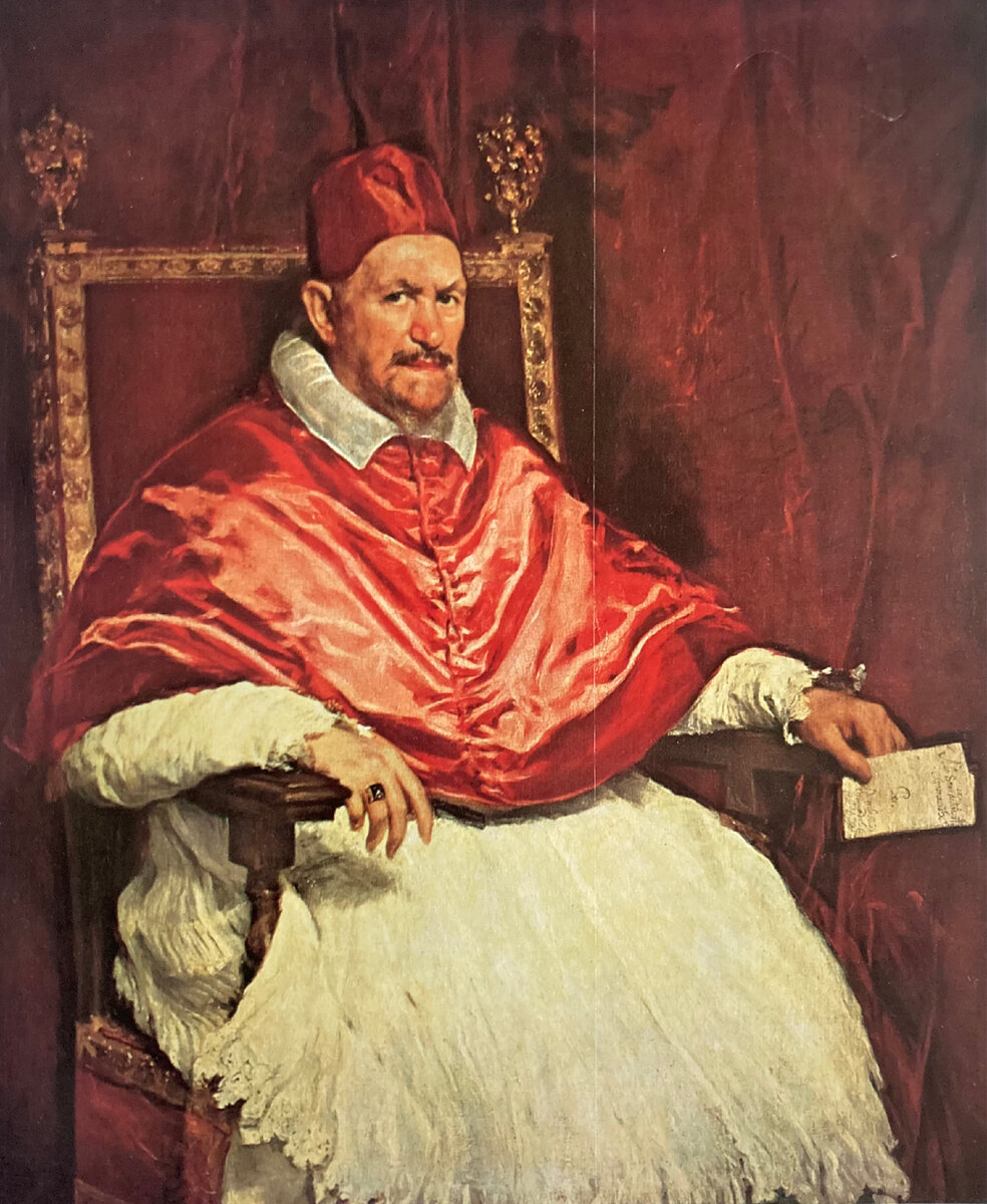 Во время своего пребывания в Риме Диего Веласкес получил почетное задание - написать портрет Папы Иннокентия X. Судя по этому портрету Папа был не самым приятным человеком. Выражение лица выдает скрытного и властного человека, который знает, как навязать свою волю. Современники описывали Иннокентия X, как корыстного и продажного человека. «E troppo vero»- «Это слишком верно»- воскликнул Папа,увидев портрет. В награду он дал художнику массивную золотую нагрудную цепь с миниатюрным портретом самого себя в медальоне, украшенном самоцветами. Портрет кисти Веласкеса приобрел необыкновенную популярность в Риме, художники копировали его, а обыватели смотрели на него,как на чудо,настолько живо был передан образ Папы Иннокентия X. Картины Веласкеса часто вдохновляли других художников и интерпретировались ими. В частности, британский художник Фрэнсис Бэкон в 20 веке написал серию из 45-ти искажённых вариаций на тему портрета Папы Иннокентия Х, известную как «Кричащие Папы». Полотна Бэкона в св