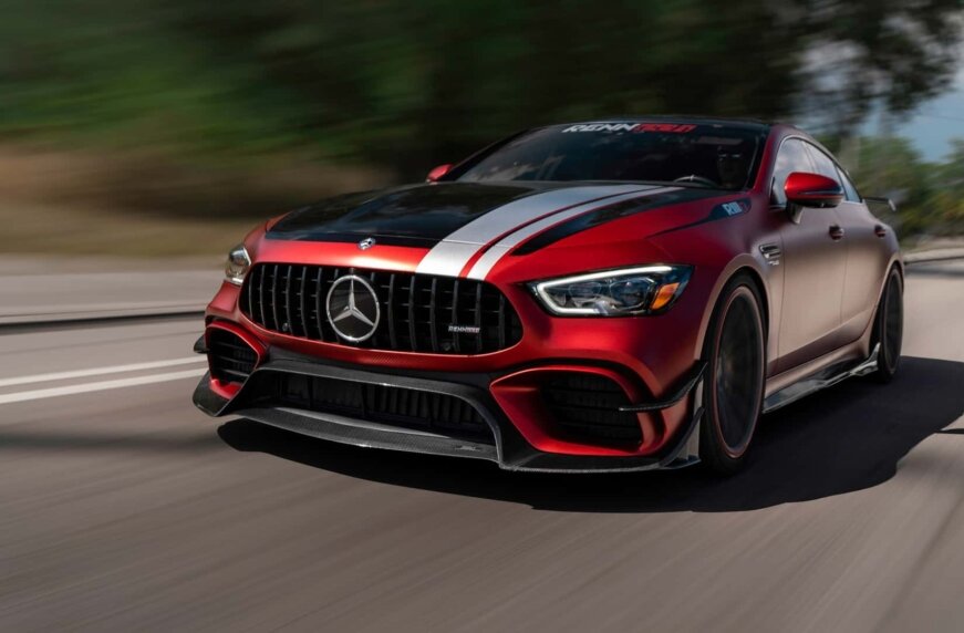 Американское тюнинг-ателье Renntech доработало высокопроизводительный Mercedes-AMG GT63. Пакет получил название RIIX и добавил седану выразительности, а также сделал его самым быстрым в истории марки. Специалисты ателье окрасили автомобиль в насыщенный красный цвет, который дополняет белая полоса, проходящая по всей длине кузова. Капот седана изготовили из неокрашенного углеродного волокна. Также установили передний сплиттер, канарды, диффузор и регулируемое заднее антикрыло из карбона. Ездит GT63 на кованых алюминиевых колесных дисках Renntech RPS 10.2 размером 21 дюйм спереди и 22 дюйма сзади. Они обуты в шины Michelin Pilot Sport 4S. Под капотом доработанного Mercedes находится 4,0-литровый битурбированный двигатель V8 мощностью 1196 л.с. и 1256 Нм крутящего момента. Он сопряжен с 9-ступенчатой автоматической коробкой передач и системой полного привода. Мотор позволяет разгоняться с места до «сотни» за 2,44 секунды и развивать максимальную скорость более 300 км/ч. Также тюнеры Ren