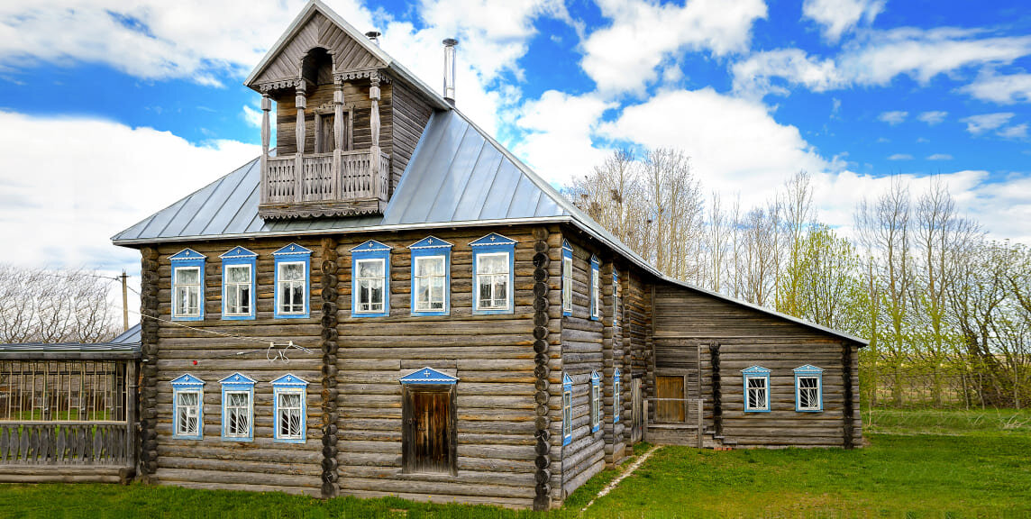 В деревнях южной части России и Сибири приусадебные постройки обычно ставили отдельно от жилья, на открытом хозяйственном дворе, окруженным высоким забором. На Севере же отдельно от жилья ставили только амбары, бани да гумна. Все другие хозяйственные помещения — хлевы, сеновалы, конюшни, сараи, и иногда даже колодцы — объединялись вместе с жильем в одно здание под общей крышей. Такой тип дома был самым удобным. В нем можно было заниматься хозяйством, не выходя наружу. На европейском Севере России крестьянский дом-двор получил повсеместное распространение. Все жилые и хозяйственно-бытовые помещения сгруппированы и объединены в один общий сруб, образующий в плане почти правильный квадрат. Жилая часть дома с крыльцом и входом обычно обращена в сторону озера, поближе к свету. Крытый двор выходит к огороду, на задворки. Огромный массив сруба перекрыт одной общей двухскатной