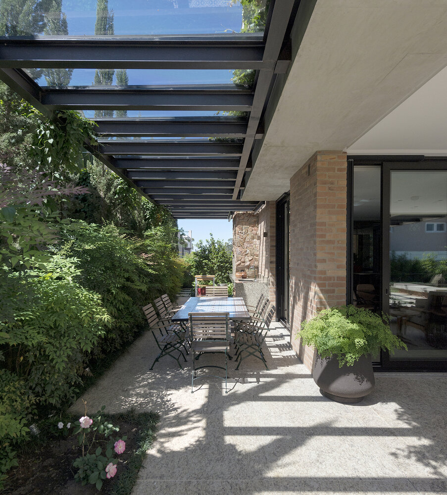 Площадь застройки 580 кв.м позволяет использовать преимущества ландшафта, оценивая композицию объемов. Сад окружен каменной стеной, которая придает уединение дому и смягчается растительностью, тщательно подобранной ландшафтными дизайнерами. Амплитуда и оптимизация использования пространств определяли взаимосвязь между средами. На первом этаже помещения полностью интегрированы, гостиная, столовая, барбекю для гурманов и балкон создают уникальное жилое пространство. Такая функциональная и визуальная интеграция возмо
