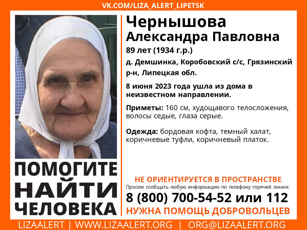 В Липецкой области ищут пропавшую 89-летнюю пенсионерку в бордовой кофте и темном халате. Александра Чернышова ушла из дома в деревне Демшинка Грязинского района в неизвестном направлении. Приметы Александры: рост 160 сантиметров, худощавое телосложение, седые волосы и серые глаза. Помимо этого, пенсионерка не ориентируется в пространстве. Одежда Александры: бордовая кофта, темный халат, коричневые туфли и коричневый платок. Помогите найти человека! Требуется помощь добровольцев", — сообщили в региональном поисково-спасательном отряде «Лиза Алерт». Всех, кто обладает какой-либо информацией, просят сообщить по номерам телефонов 8-800-700-54-52 или 112.