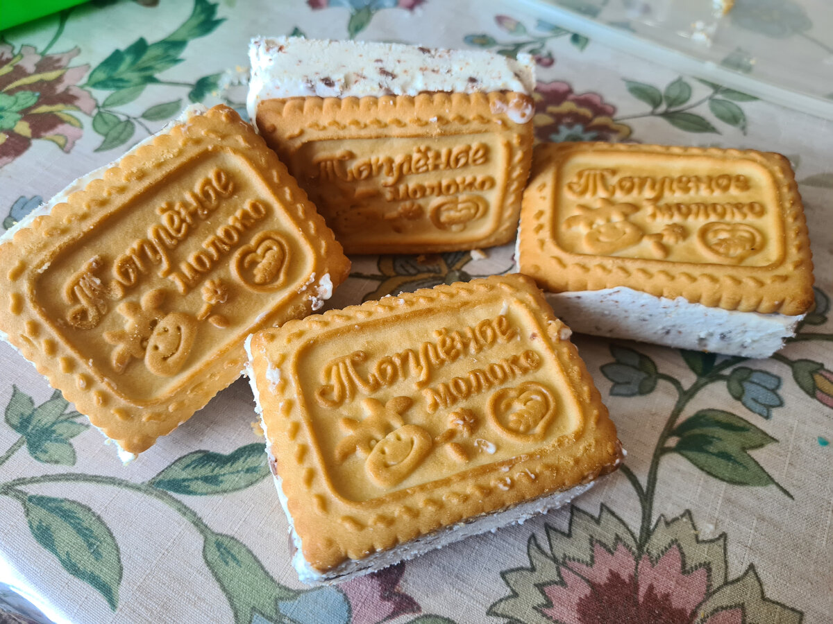Следующий рецептик мороженого. Точнее тут больше изменение в подаче, а не в рецепте. Я взяла мороженое из предыдущей статьи. Объем только поменьше, а именно: 250 грамм сливок, 50 грамм сахарной пудры и 75 грамм шоколада. Шоколад также превратила в шоколадную крошку, сливки взбила с сахарной пудрой и всё объединила. Затем нашла примерно подходящий пластиковый контейнер и взяла вот такое печенье. Выложила печенье вниз красивой стороной. Положила всё мороженное на печенье. И накрыла следующим печеньем. Закрыла крышкой и убрала в холодильник на 8 часов. Затем достала, разрезала мороженое между печеньем. Вытащила мороженое и края слегка обрезала, чтобы мороженое было красивым)) Кстати, остатки можно съесть пока никто не видит)) Вот и всё, мороженое в печенье готово. Можно разложить его по пакетикам и убрать обратно в морозилку. А можно съесть здесь и сейчас!) Готовьте! Радуйте себя и своих близких ❤ Приятного аппетита 🥰 Заходи ко мне на канал и подпишись, пожалуйста, а я буду радовать