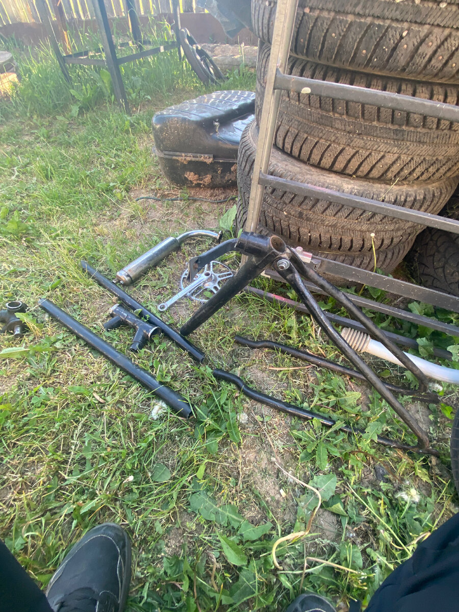 Всем привет. Сегодня с Макаром успели распилить раму под будущий вело мото чоппер. Делать мы планируем по моему наброску который я вчера ночью нарисовал, и мы единогласно согласились с такой конструкцией. Завтра будем уже варить раму и доделаем заднее колесо до ума. Ещё нужно будет сделать что то с глушителем, так как с ним из мотора переработанные газы уже не выходят и он может глохнуть. Можно конечно и убрать его вообще, но тогда мотор будет очень громким и если под поршень попадёт какой то шлак или ветка, то проект можно сказать умер, так как бюджет у нас закончится на стадии покупки свечи, шланга и тросика для карбюратора. Не смотря на это нам в необходимом порядке нужна ручка газа и по возможности ручной стартер, и по возможности в будущем можно было бы заменить поршневую с 50 кубов на 70 кубов, что будет хорошо сказываться на тяги в горку, если будет хватать и 50 кубов в горку, то когда мы будем ставить на 70 кубов можно будет заднюю звезду заменить с 42 зубов на меньшее количе